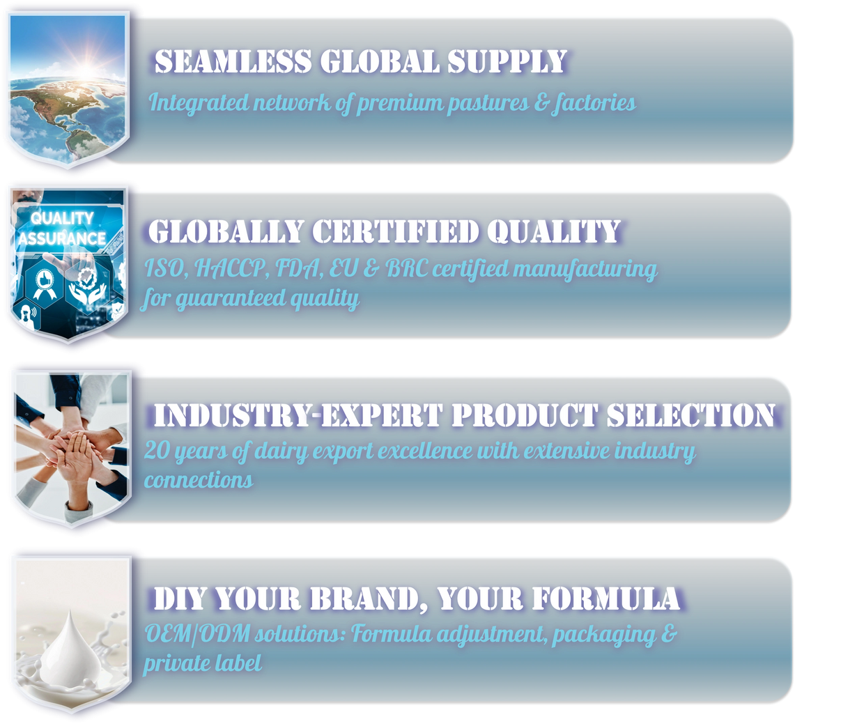 We are a specialized dairy export enterprise dedicated to providing global clients with high-quality, safe, and traceable dairy products and raw materials. Leveraging China's premium milk sources combined with advanced production technologies and a global logistics network, we export superior dairy products to Southeast Asia, the Middle East, Africa, and beyond – meeting diverse market demands across regions.
